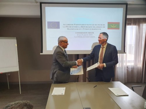 وفي ختام الاجتماعين، أشرف كل من الأمين العام لوزارة الصيد والبنى التحتية البحرية والمينائية، السيد سيد عالي ولد سيدي بوبكر، رئيس الوفد الموريتاني، والسيد لويس موليدو، رئيس وحدة بالإدارة العامة للشؤون البحرية والصيد بالمفوضية الأوروبية ورئيس الوفد الأوروبي، على توقيع محضري الاجتماعين المتعلقين بالدعم القطاعي للصيد وبالجولة الأولى من مفاوضات اتفاقية الشراكة في مجال الصيد بين موريتانيا والاتحاد الأوروبي.